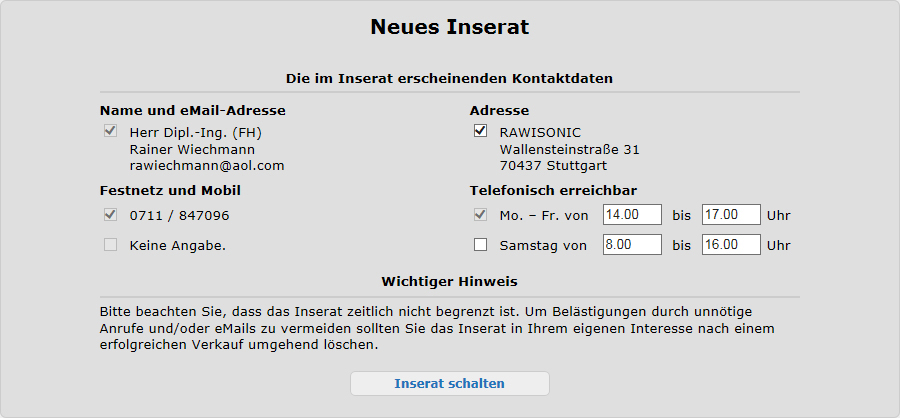 Als letzter Schritt erfolgt die Auswahl der im Inserat angezeigten Kontaktdaten und die Angabe der